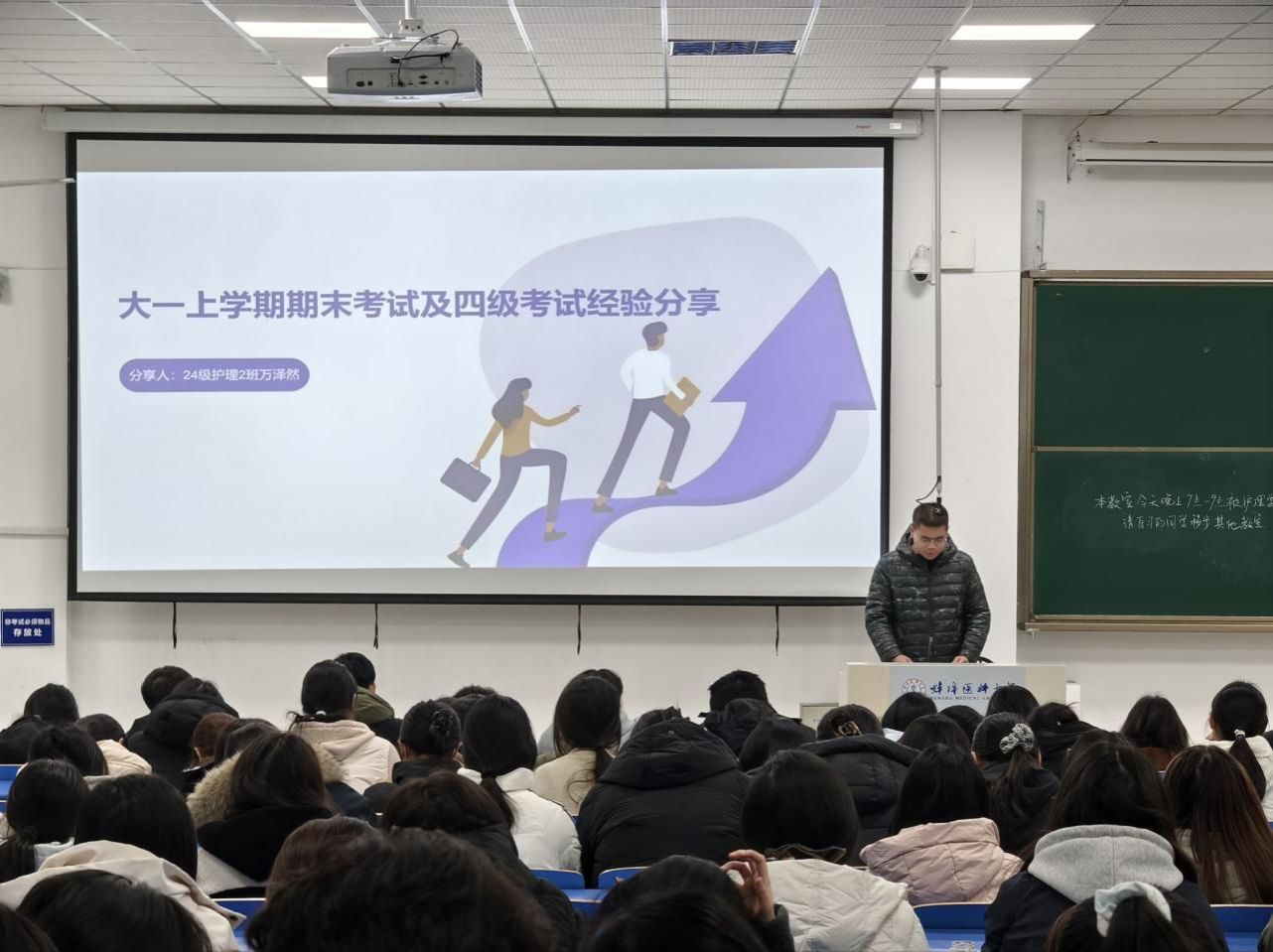 会议分为四个环节。张礼老师首先就考风考纪与诚信应考进行强调。随后,四位24级优秀学长学姐依次登台,围绕时间规划、题型突破、记忆技巧、心态调整等方面展开分享,为25级同学提供实用备考建议。最后,学生会主席团万泽然同学进行总结,并祝愿新生在考试中取得优异成绩。