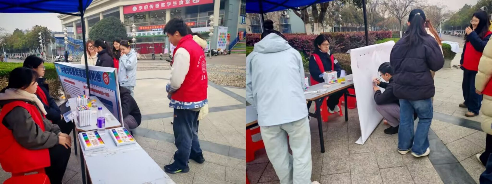 青年志愿者协会在食堂大圆盘处举办“绘笔劳动初印象”劳动教育摆台活动。活动以创意绘画的方式引导学生感知劳动内涵、体悟劳动价值,吸引了众多学生参与。