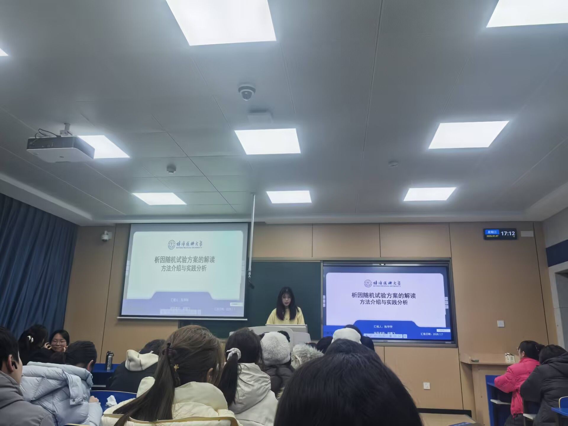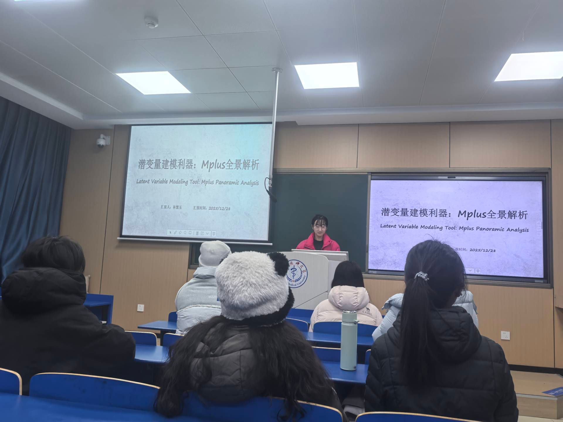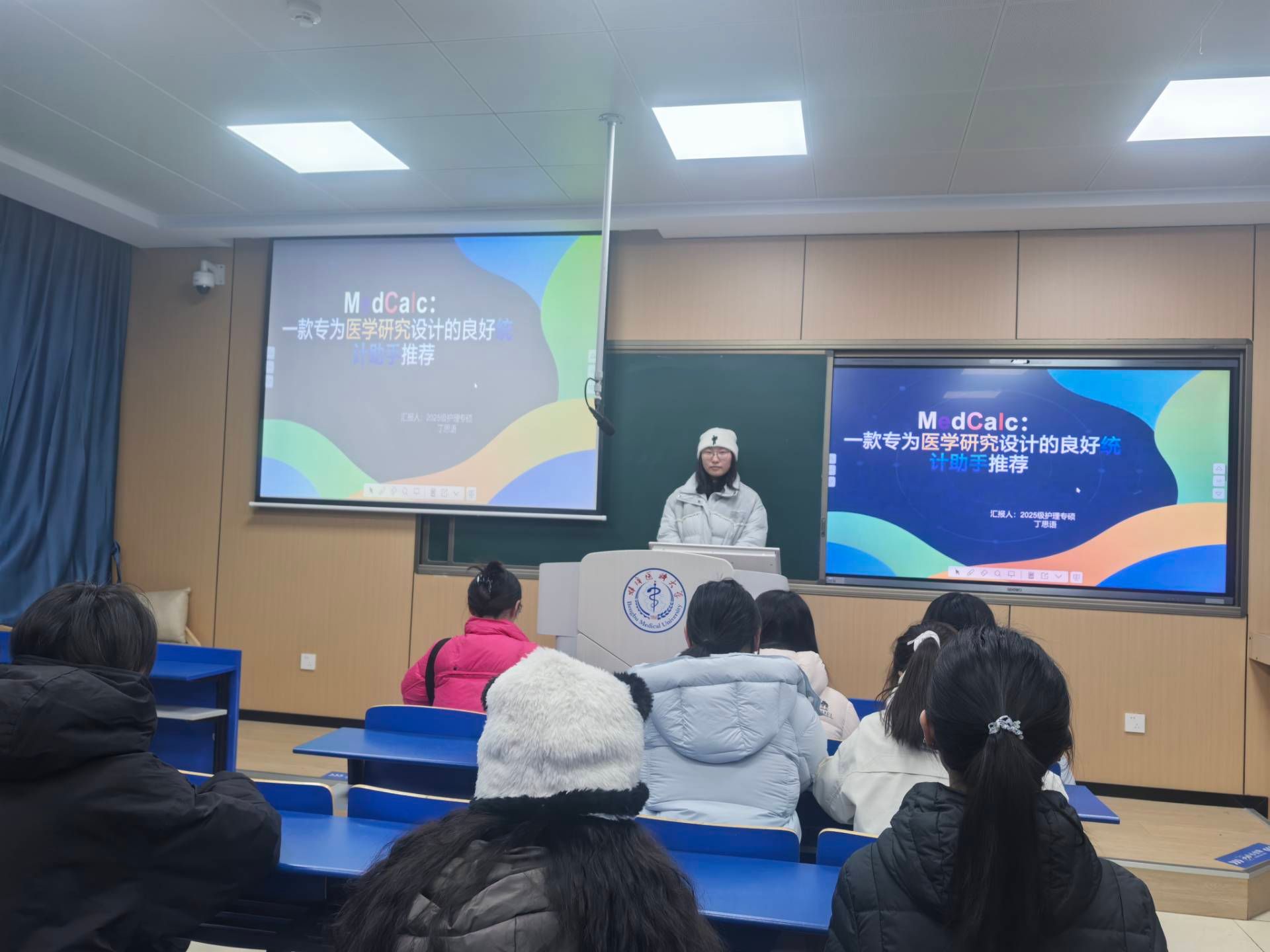 25级专硕李朵以《如何正确评估一篇文献的方法学质量》为题,系统梳理了研究设计合理性、样本量计算、偏倚控制等核心评估维度,并结合护理随机对照试验案例,现场演示CASP评估清单的应用方法;25级专硕陈甲甲在《析因随机试验方案解读》中,针对护理干预研究中的多因素交互效应问题,通过案例详细讲解了析因设计的分组逻辑、样本量计算与结果分析要点;25级学硕林繁玉带来《潜变量建模利器:Mplus 全景解析》,展示了结构方程模型在护理心理测评中的应用流程,并分享了模型拟合、参数报错等常见问题的处理技巧;24级专硕吕雅雯基于自身经验,总结《学术期刊选择与投稿全流程指南》,从方向契合、影响因子、审稿周期等多角度分析期刊匹配策略,并介绍了多个核心期刊的收稿特点;25级专硕丁思语通过视频详细讲解了MedCalc软件在统计绘图中的使用技巧。